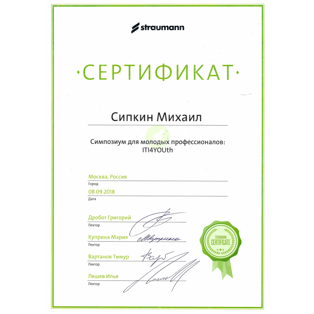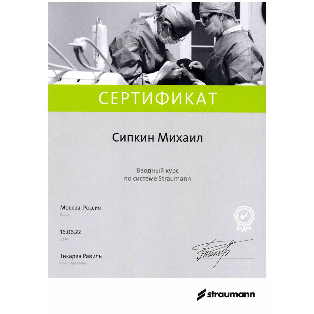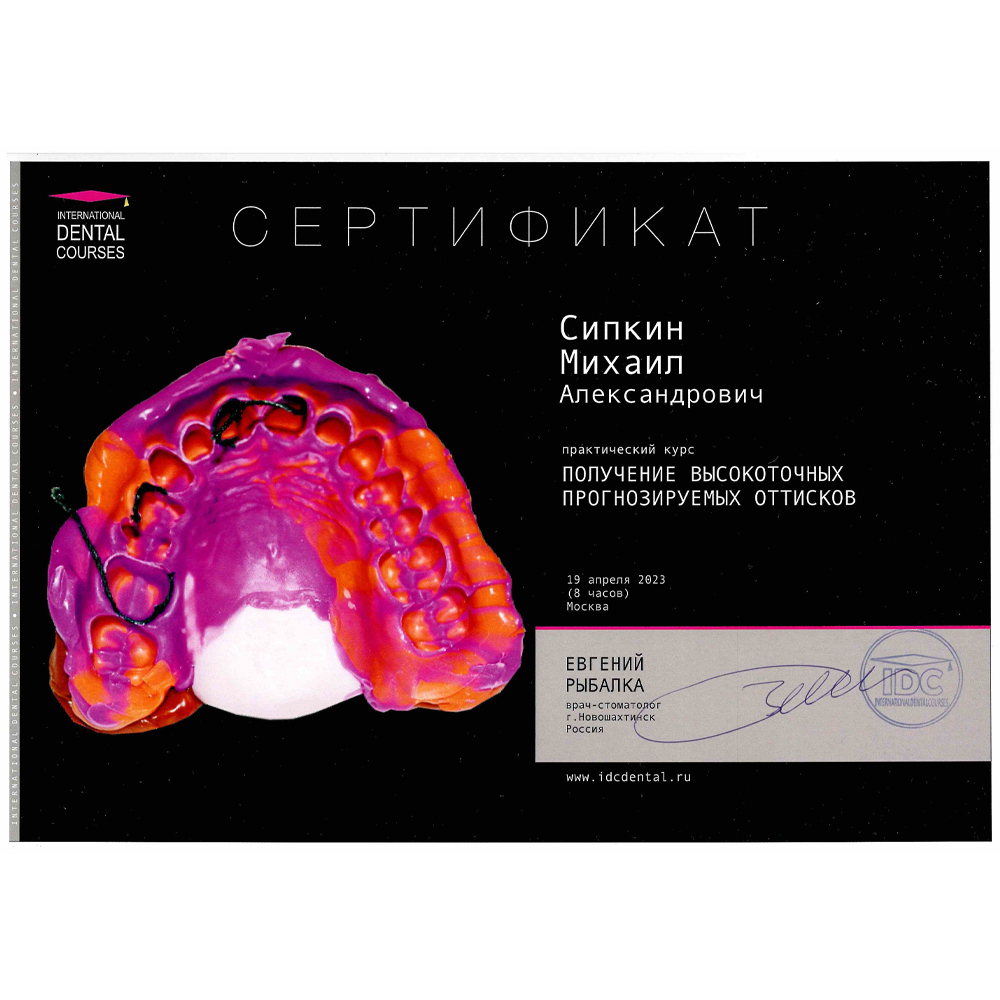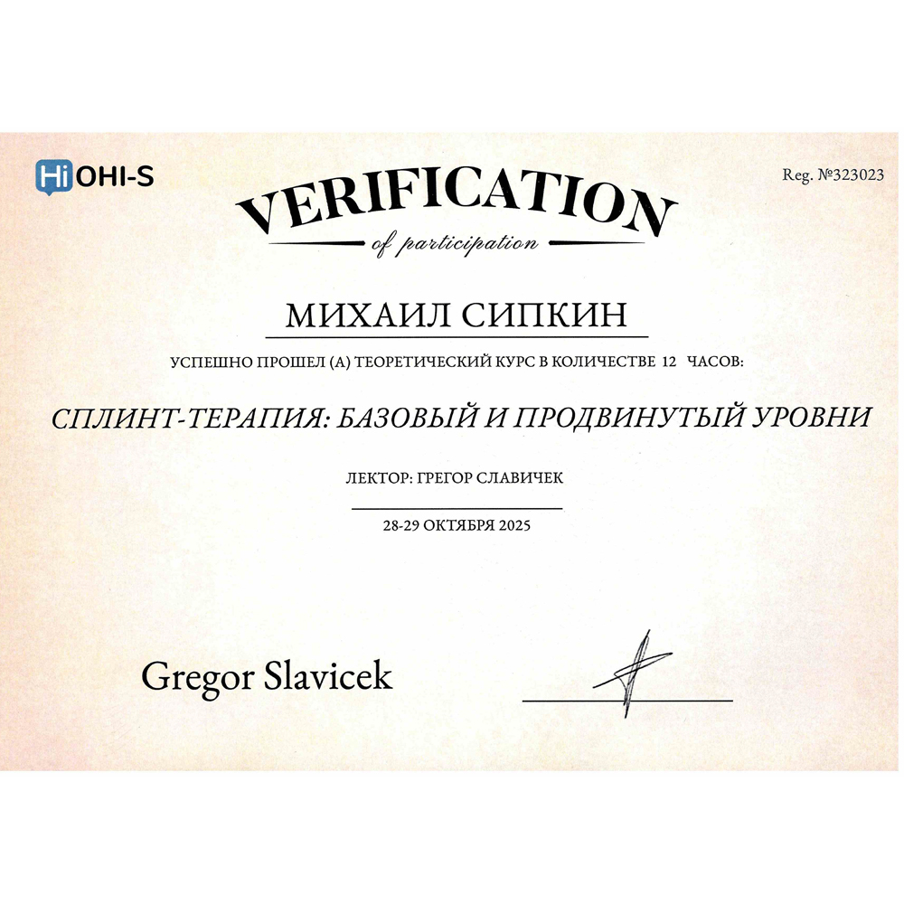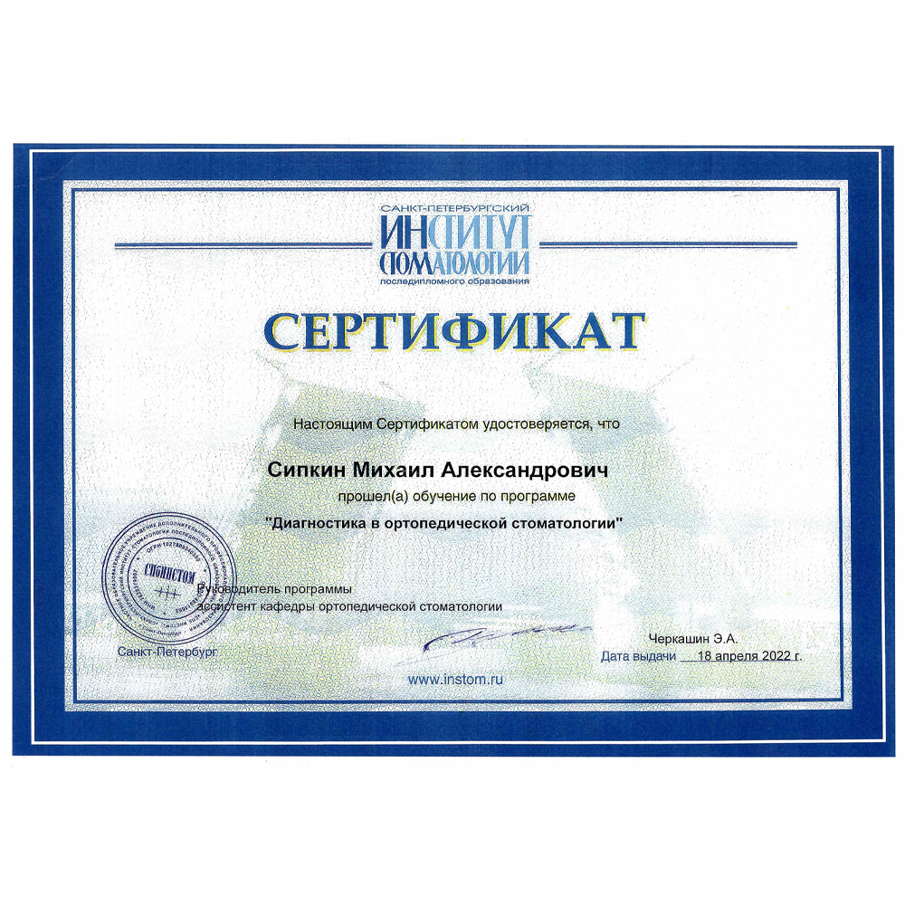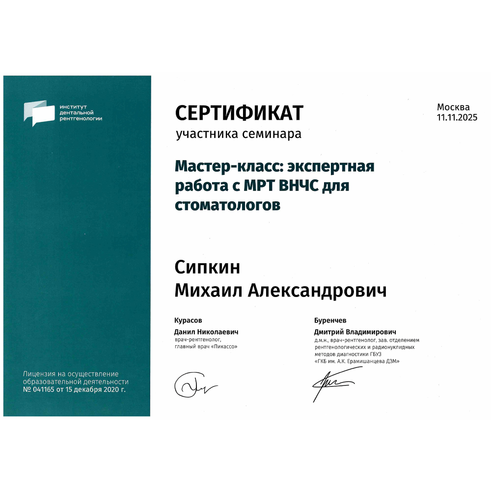 - Диплом об окончании ординатуры. Выдан ГБУЗ МО «Московский областной научно-исследовательский клинический институт им. М.Ф. Владимирского» (ГБУЗ МО МОНИКИ им. М.Ф. Владимирского) г. Москва 31.08.2023, присвоена квалификация Врач-стоматолог-ортопед.