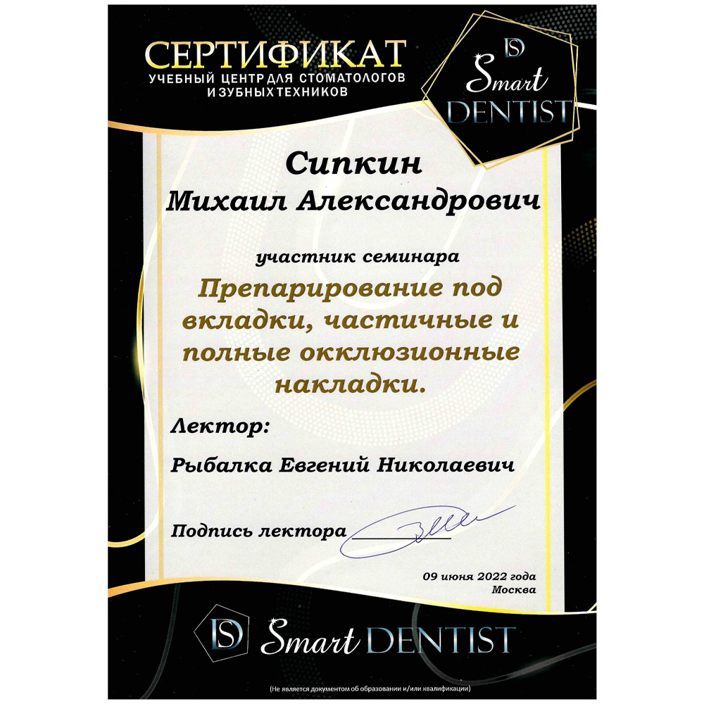 - Диплом специалиста о высшем образовании. Выдан ФГБОУ ВО «Московский государственный медико-стоматологический университет имени А.И. Евдокимова» МЗ РФ г. Москва 01.07.2021, присвоена квалификация Врач-стоматолог.